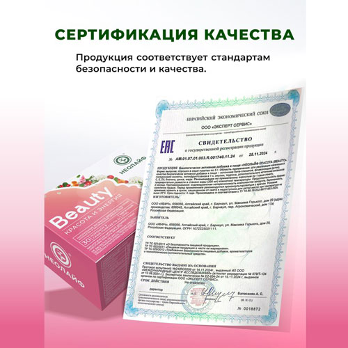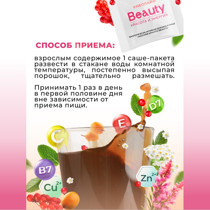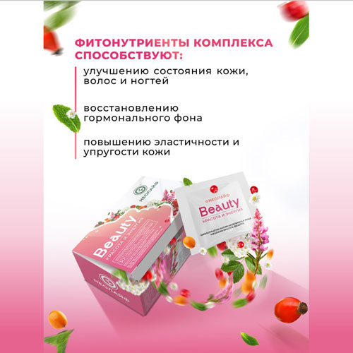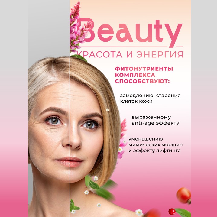 Тонизирующий напиток для ежедневного использования, который поддерживает красоту и здоровье тела. Уникальное сочетание качественных ингредиентов насыщает организм фитонутриентами, дарит энергию и помогает сохранить молодость: замедляет старение кожи, повышает её упругость и эластичность, уменьшает мимические морщины и неровности, создаёт лёгкий лифтинг. Улучшает внешний вид кожи и дарит сияние; волосы становятся шелковистыми, ногти — крепкими и блестящими. Компоненты поддерживают настроение и стрессоустойчивость, нормализуют гормональный фон и повышают уверенность в себе.