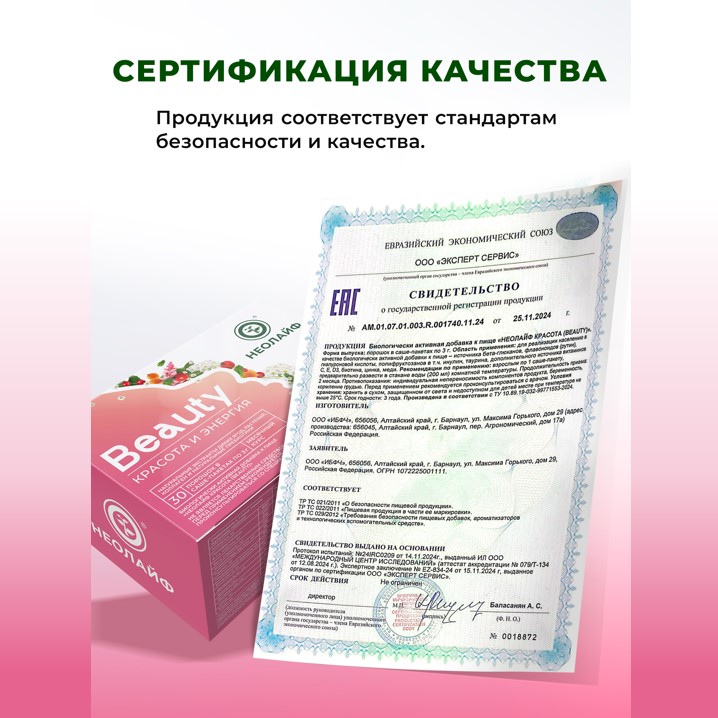 Коллаген морской, экстракт плодов шиповника, инулин, олигофруктоза, бета-глюканы, гороховые волокна, таурин, L-аскорбиновая кислота (витамин С), экстракт плодов калины, гиалуроновая кислота, DL-токоферола ацетат (витамин Е), цинка глюконат, экстракт корня шлемника байкальского, экстракт корня копеечника, экстракт плодов облепихи, экстракт листьев мяты, экстракт корня валерианы, экстракт травы эспарцета, экстракт корня астрагала перепончатого, экстракт травы ярутки полевой, экстракт травы сурепки, экстракт травы горца птичьего, экстракт листьев брусники, экстракт листьев и цветков лабазника вязолистного, экстракт корня солодки, экстракт травы тысячелистника, экстракт листьев грушанки, экстракт корня лопуха, экстракт коры осины, холекальциферол (витамин D3), меди глюконат, биотин. Область применения: для реализации населению в качестве биологически активной добавки к пище – источника бета-глюканов, флавоноидов (рутин), гиалуроновой кислоты, полифруктозанов в т.ч. инулин, таурина, дополнительного источника витамина С, E, D3, биотина, цинка, меди.