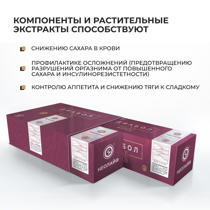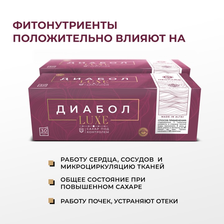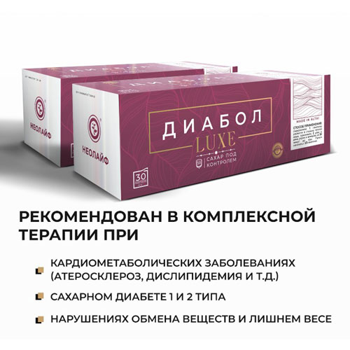 ДИАБОЛ LUXE нормализует работу эндокринной системы; предотвращает разрушение организма от повышенного уровня сахара и последствий диабетического статуса; профилактирует развитие сахарного диабета и заболеваний сердечно-сосудистой системы, улучшает работу сердца, сосудов и почек; понижает уровень сахара как самостоятельное средство, так и в составе комплексной терапии; улучшает общее самочувствие при диабете; укрепляет стенки сосудов и капилляров…