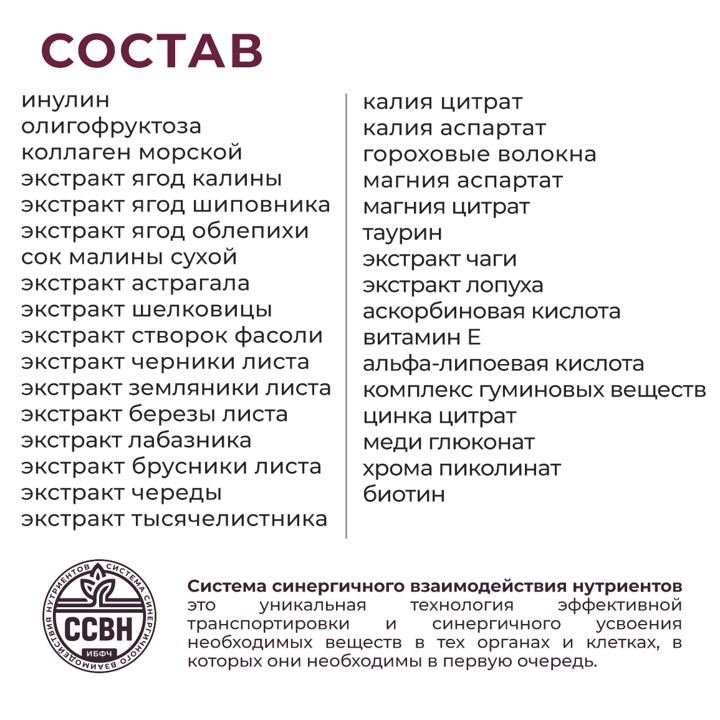 Инулин, олигофруктоза, коллаген морской, экстракт ягод калины, экстракт ягод шиповника, экстракт ягод облепихи, сок малины сухой, экстракт астрагала перепончатого, экстракт шелковицы белой, экстракт створок фасоли, экстракт черники листа, экстракт земляники листа, экстракт березы листа, экстракт лабазника вязолистного, экстракт брусники листа, экстракт череды трехраздельной, экстракт тысячелистника, калия цитрат, калия аспартат, гороховые волокна, магния аспартат, магния цитрат, таурин, экстракт чаги, экстракт лопуха, аскорбиновая кислота, витамин Е, альфа-липоевая кислота, комплекс гуминовых веществ, цинка цитрат, меди глюконат, хрома пиколинат, биотин.