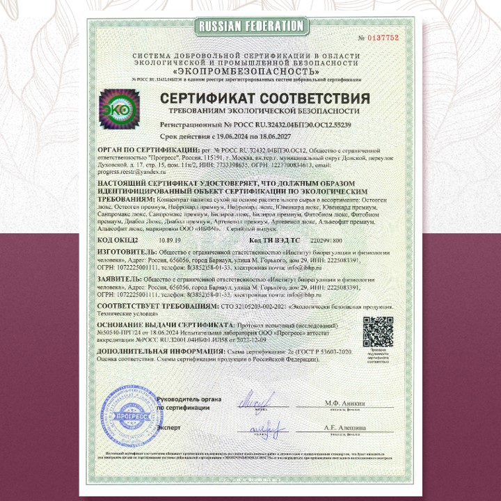 Вся продукция сертифицирована : Вся продукция, производимая компанией ООО «ИНСТИТУТ БИОРЕГУЛЯЦИИ И ФИЗИОЛОГИИ ЧЕЛОВЕКА», имеет все необходимые сертификаты соответствия и соответствует всем государственным стандартам качества.