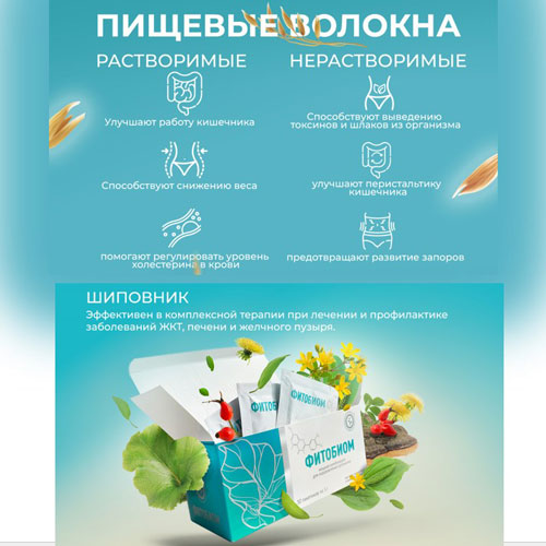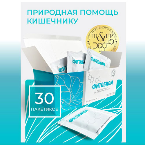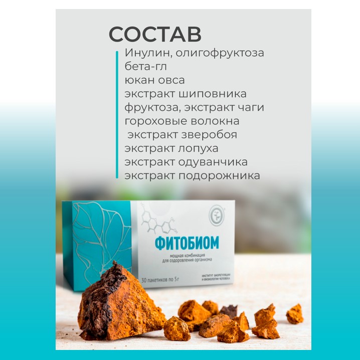 ДЛЯ ЗАЩИТЫ КИШЕЧНИКА. ФИТОБИОМ -полностью натуральный продукт на основе растворимых и нерастворимых пищевых волокон, а также специально разработанных растительных экстрактов, полученных по уникальной технологии, содержащий в своем составе инулин, олигофруктозу, бета-глюкан овса, гороховые волокна, экстракты зверобоя, лопуха, одуванчика, подорожника, чаги и шиповника.