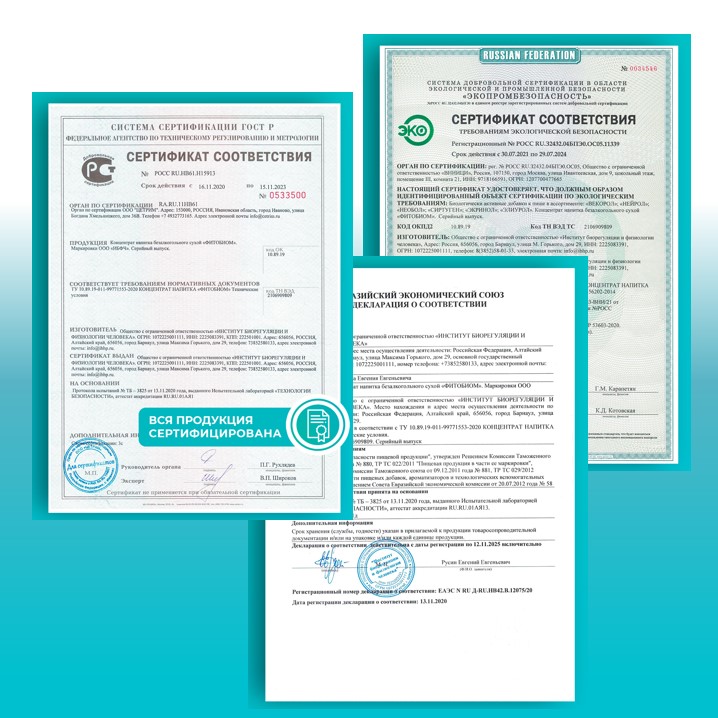 Вся продукция сертифицирована : Вся продукция, производимая компанией ООО «ИНСТИТУТ БИОРЕГУЛЯЦИИ И ФИЗИОЛОГИИ ЧЕЛОВЕКА», имеет все необходимые сертификаты соответствия и соответствует всем государственным стандартам качества.