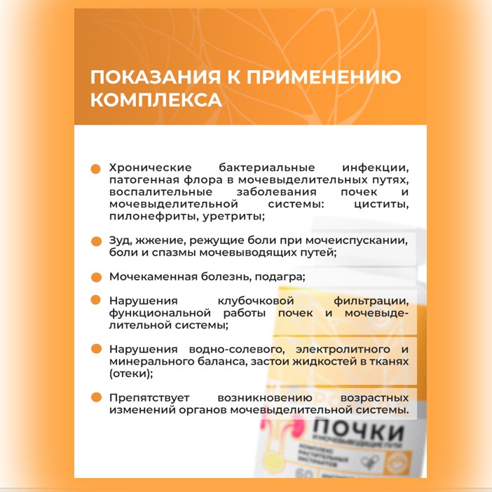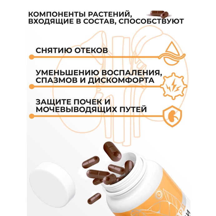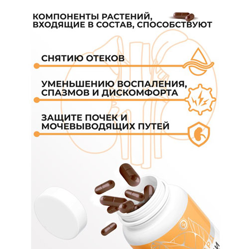 Общеукрепляющий комплекс, предотвращающий развитие нарушений функциональной работы почек и мочевого пузыря, улучшает клубочковую фильтрацию и детоксикационные механизмы почечного аппарата.