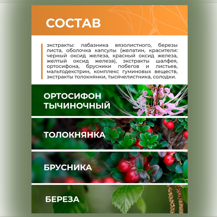 Состав (основные ингредиенты): экстракты: лабазника вязолистного, березы листа, оболочка капсулы (желатин, красители: черный оксид железа, красный оксид железа, желтый оксид железа), экстракты шалфея, ортосифона, брусники побегов и листьев, мальтодекстрин, комплекс гуминовых веществ, экстракты толокнянки, тысячелистника, солодки.
