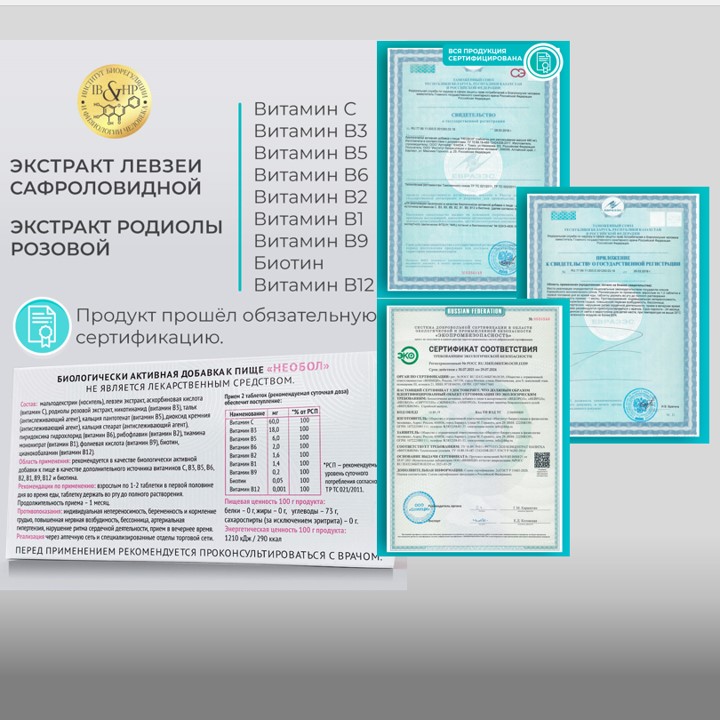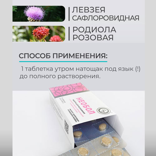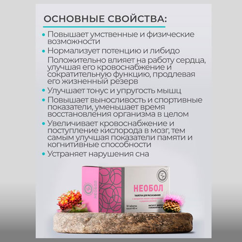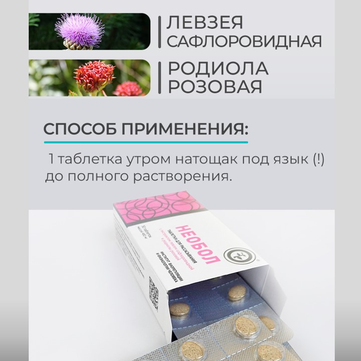 ПРИ ВЫСОКИХ НАГРУЗКАХ. «Необол» - таблетки подъязычные для рассасывания 30 штук. Содержит экстракт левзеи сафлоровидной, родиолы розовой и комплекс витаминов (С, В1, В2, В3, В5, В6, Биотин, В9, В12). Обладает выраженной анаболической активностью, способствует приросту мышечной массы, но не проявляет гормоноподобных свойств. Повышает поступление кислорода и питательных веществ в органы и ткани.