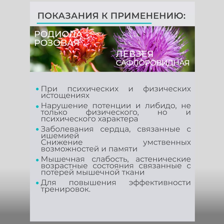 Содержит экстракт левзеи сафлоровидной, родиолы розовой и комплекс витаминов (С, В1, В2, В3, В5, В6, Биотин, В9, В12).
