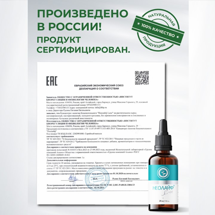 НАПИТОК «НЕОЛАЙФ LUXE» создан на основе экстракта реликтовой органики — продукта природного происхождения, полученного по современной инновационной технологии многоступенчатой экстракции, разработанной в Институте Биорегуляции и Физиологии Человека (ИБФЧ), позволяющей извлекать полный комплекс веществ в неизменной природной биологически активной форме.