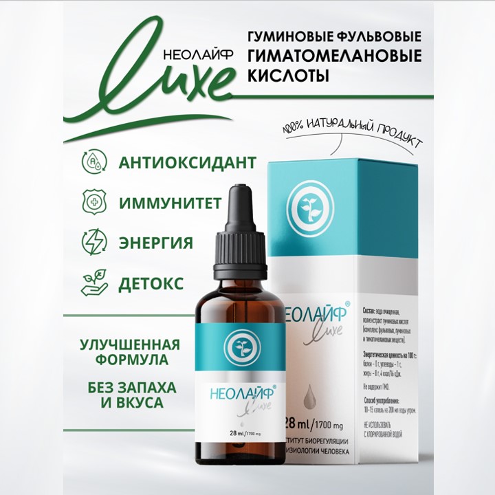 НАПИТОК (концентрат фульвовых веществ) «НЕОЛАЙФ LUXE» новый продукт для здоровья с увеличенным содержанием гиматомелановых фракций для человека. Гуминовые вещества (в том числе фульвовые и гиматомелановые) эффективно повышают устойчивость организма к воздействию вирусов большинства видов, включая ретровирусы и вирусы простого герпеса. Более выраженный эффект Неолайф Luxe достигается благодаря комплексному воздействию на организм входящих в него фульвовых, гуминовых и повышенной концентрации гиматомелановых веществ, а также благодаря адаптированному соотношению действующих веществ, полученных по новым методам экстракции.
