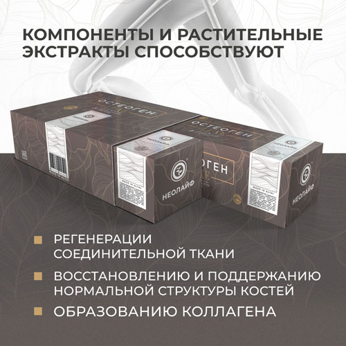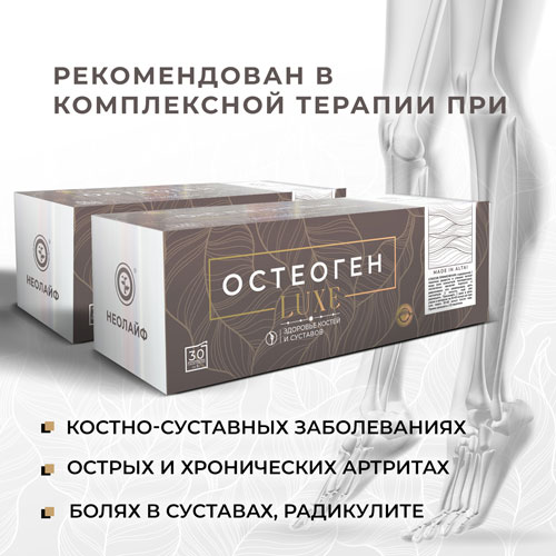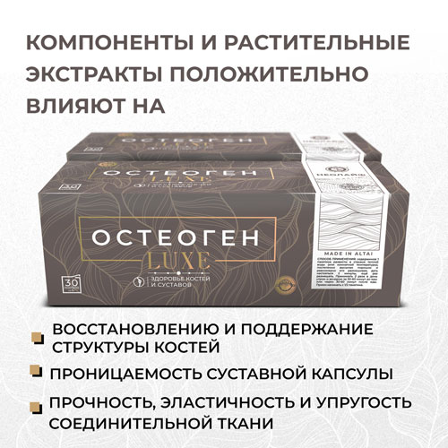 ОСТЕОГЕН LUXE оказывает общеукрепляющее и тонизирующее действие; снимает боль и воспаление при костно-суставных заболеваниях (артриты, остеохондроз, грыжи, остеопороз, подагра и т.д.); способствует восстановлению и регенерации поврежденной хрящевой и костной ткани; препятствует развитию деструктивных процессов в хрящевой ткани и позвоночнике; улучшает состояние кожи, волос и ногтей …