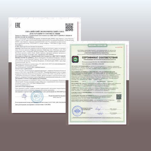 Вся продукция сертифицирована : Вся продукция, производимая компанией ООО «ИНСТИТУТ БИОРЕГУЛЯЦИИ И ФИЗИОЛОГИИ ЧЕЛОВЕКА», имеет все необходимые сертификаты соответствия и соответствует всем государственным стандартам качества.