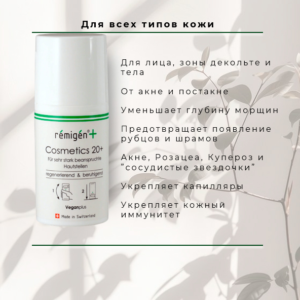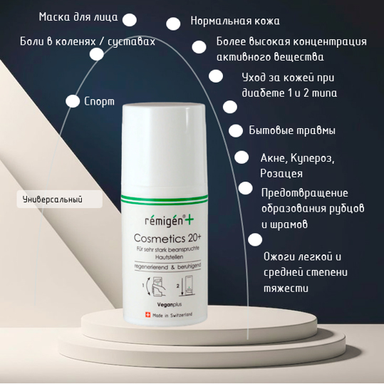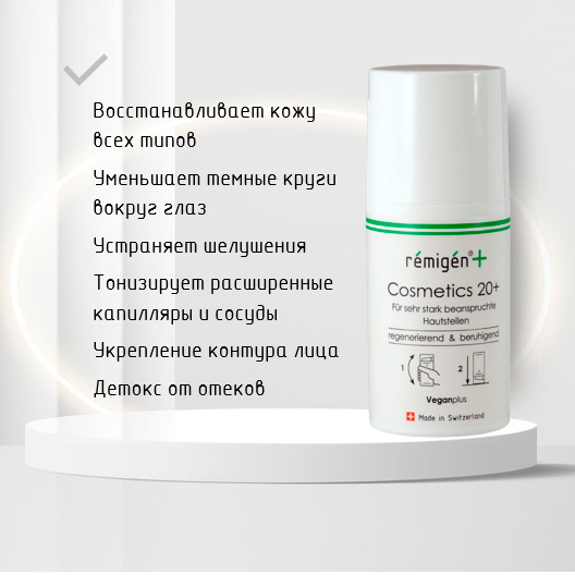 Remigen Cosmetics 20+ - универсальная сыворотка с широким спектром применения, которая помогает восстановить и улучшить состояние кожи, тканей и организма в целом, это безопасное средство для комплексного восстановления организма. Его уникальные свойства позволяют использовать его как в косметологии для омоложения кожи и устранения дефектов, так и в медицине для помощи в лечении синдромов различных заболеваний и травм. Регулярное применение способствует укреплению тканей, ускорению регенерации и повышению общего тонуса организма.