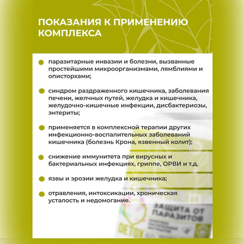 Общеукрепляющий комплекс с детокс-эффектом, улучшающий пищеварение и очищающий организм от токсинов, а также борющийся с паразитами и патогенной микрофлорой.
