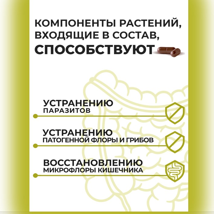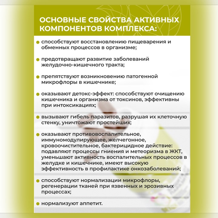 Общеукрепляющий комплекс, оказывающий детокс-эффект, способствует очищению кишечника и организма от токсинов, а также восстановлению пищеварения и обменных процессов в организме; препятствует возникновению патогенной микрофлоры в кишечнике. Компоненты растений, входящих в состав, способствуют устранению паразитов, патогенной флоры и грибов, восстановлению микрофлоры кишечника.