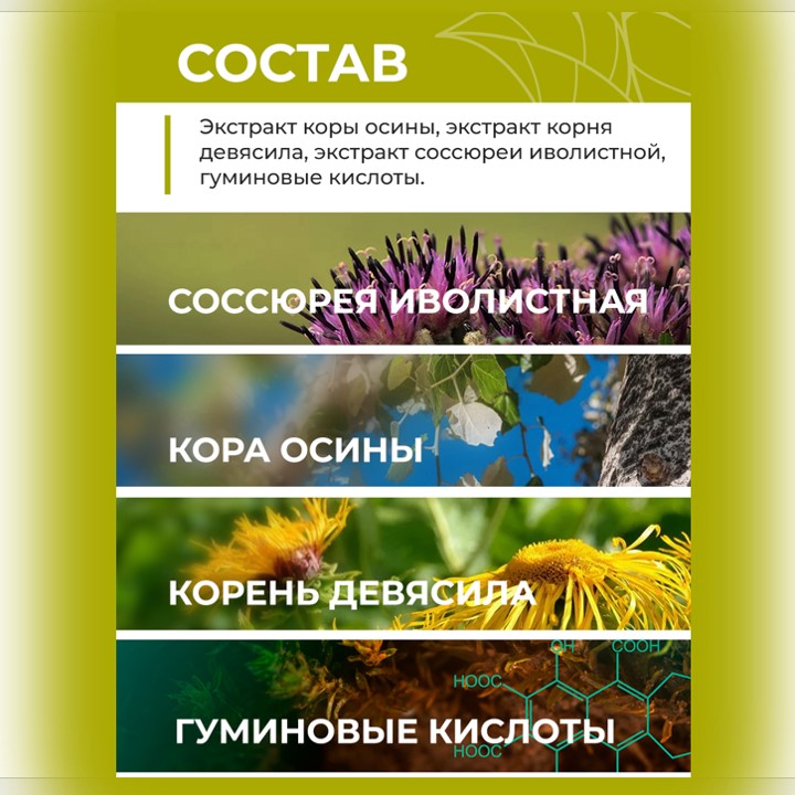 Состав (основные ингредиенты): экстракт коры осины, экстракт корня девясила, оболочка капсулы (желатин, черный оксид железа, красный оксид железа, желтый оксид железа), экстракт соссюреи иволистной, мальтодекстрин, гуминовые кислоты.