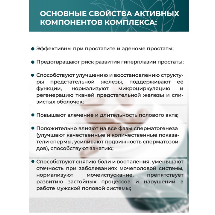 Состав (основные ингредиенты): экстракт астрагала перепончатого, оболочка капсулы (желатин, красители: черный оксид железа, красный оксид железа, желтый оксид железа), экстракты копеечника забытого, горца птичьего, брусники побегов и листьев, грушанки, эспарцета, сурепки, лопуха большого, коры осины, мальтодекстрин, комплекс гуминовых веществ, экстракт лабазника вязолистного, экстракт солодки.