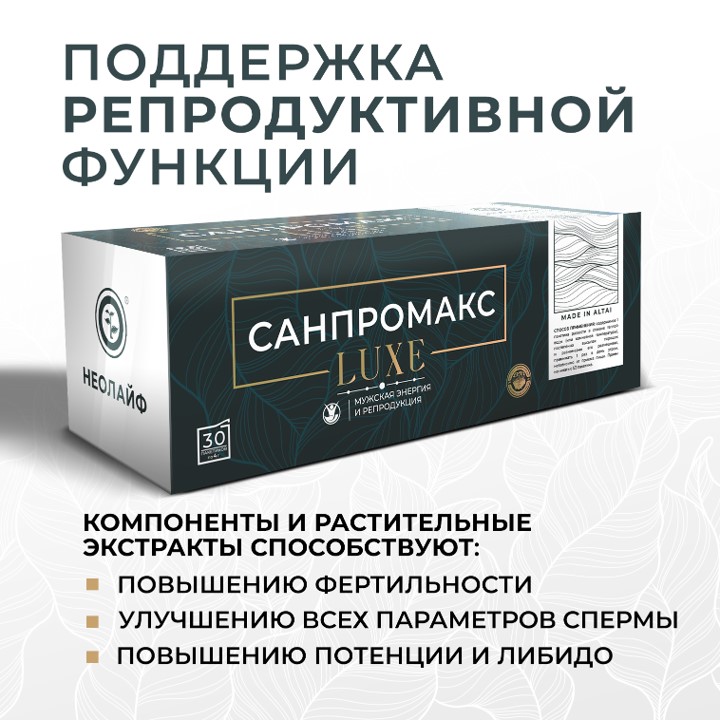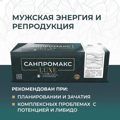 МУЖСКАЯ ЭНЕРГИЯ И РЕПРОДУКЦИЯ. САНПРОМАКС LUXE нормализует обмен веществ, повышает иммунитет, умственную и физическую работоспособность; улучшает потенцию и либидо, повышает фертильность; увеличивает физическую и умственную активность и способствует приливу сил, улучшает настроение; эффективен при простатите и аденоме простаты…