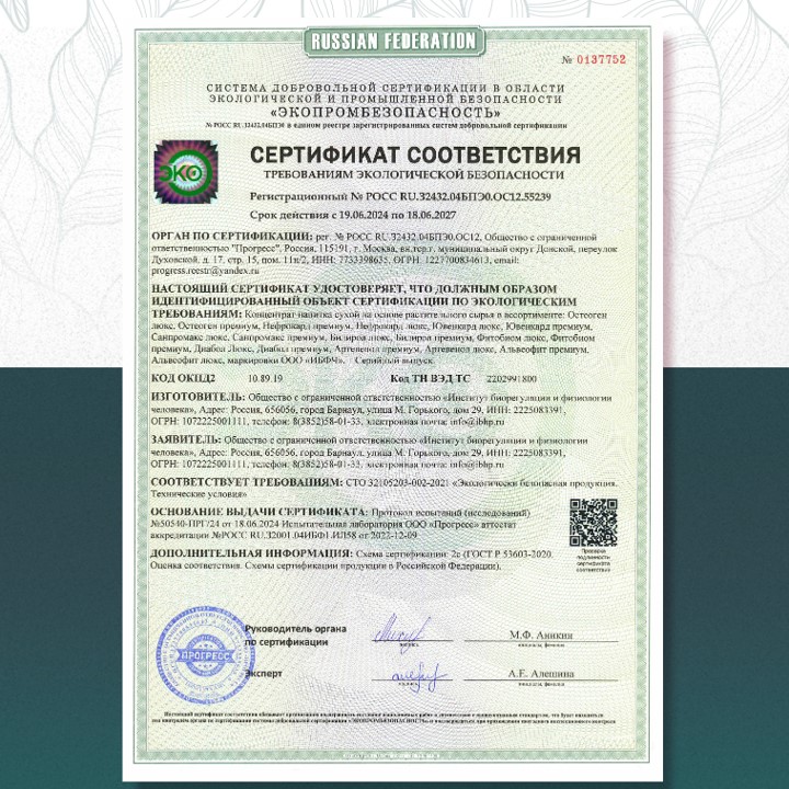Вся продукция сертифицирована : Вся продукция, производимая компанией ООО «ИНСТИТУТ БИОРЕГУЛЯЦИИ И ФИЗИОЛОГИИ ЧЕЛОВЕКА», имеет все необходимые сертификаты соответствия и соответствует всем государственным стандартам качества.