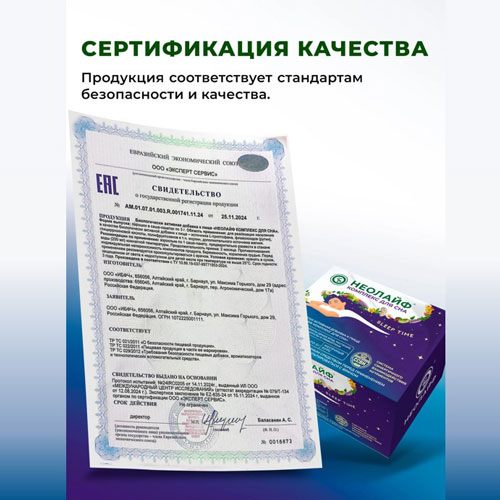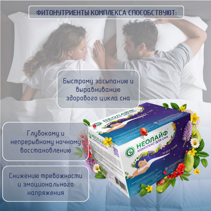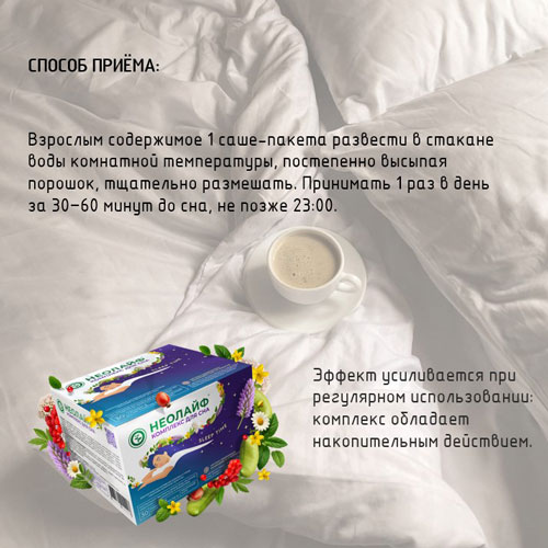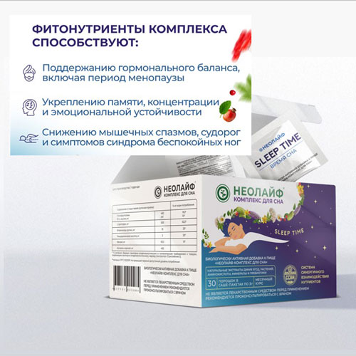 НЕОЛАЙФ SLEEP TIME - вечерний напиток, разработанный для вашего комфортного и качественного сна. Уникальный комплекс, содержащий фитонутриенты, аминокислоты, минералы и пребиотики, способствует восстановлению здорового цикла сна и бодрствования, помогая вам проснуться отдохнувшим и полным энергии. Компоненты SLEEP TIME своим успокаивающим действием помогут расслабиться и подготовиться ко сну, наладят процесс засыпания и восстановят организм в течении ночи (особенно при менопаузе) без привыканий. Комплекс способствует восстановлению при гормональных и эмоциональных сбоях, улучшению настроения, что, в свою очередь, снижает уровень стресса, тревожности и депрессии.