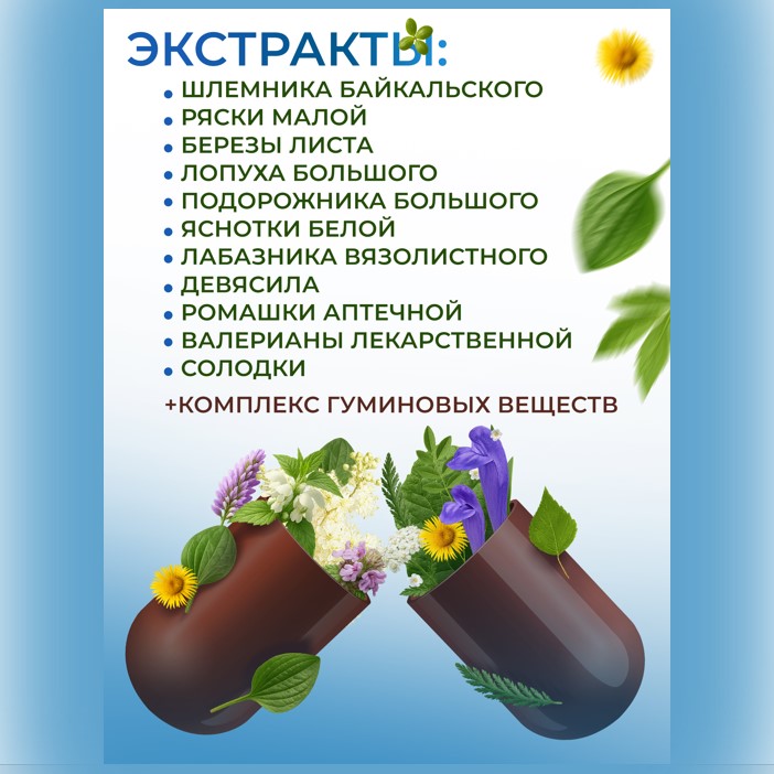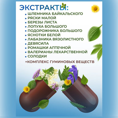 Состав (основные ингредиенты): экстракт шлемника байкальского, оболочка капсулы (желатин, красители: черный оксид железа, красный оксид железа, желтый оксид железа), экстракты ряски малой, березы листа, лопуха большого, подорожника большого, яснотки белой, лабазника вязолистного, девясила, мальтодекстрин, комплекс гуминовых веществ, экстракты ромашки аптечной, валерианы лекарственной, солодки.