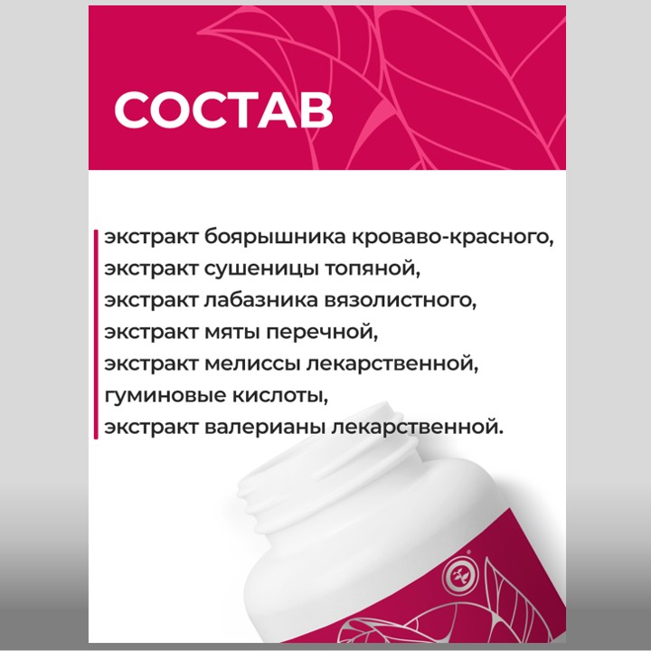 Состав (основные ингредиенты): экстракт боярышника кроваво-красного, оболочка капсулы (желатин, черный оксид железа, красный оксид железа, желтый оксид железа), экстракт сушеницы топяной, экстракт лабазника вязолистного, экстракт мяты перечной, экстракт мелиссы лекарственной, мальтодекстрин, гуминовые кислоты, экстракт валерианы лекарственной.