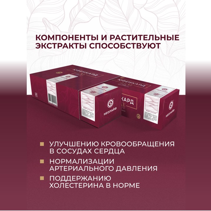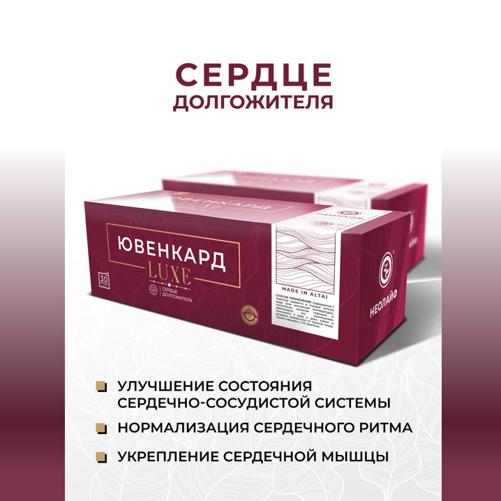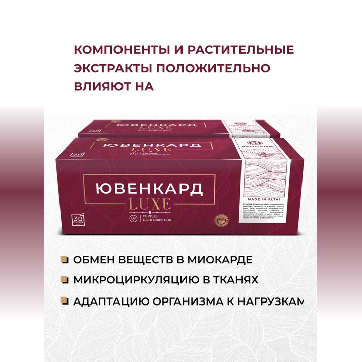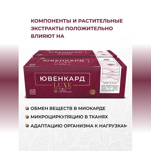 ЮВЕНКАРД LUXE эффективен при различных заболеваниях сердечно-сосудистой системы (аритмии, гипертонии, инфаркты и т.д), а также кардиометаболических заболеваниях (атеросклероз, сахарный диабет 2-го типа, ожирение, дислипидемия); оказывает гармонизирующее действие на сердечно-сосудистую и нервную систему; улучшает сон, уменьшает тревогу, обладает успокаивающими свойствами; укрепляет сосуды и сердечную мышцу; нормализует сердечный ритм и артериальное давление …