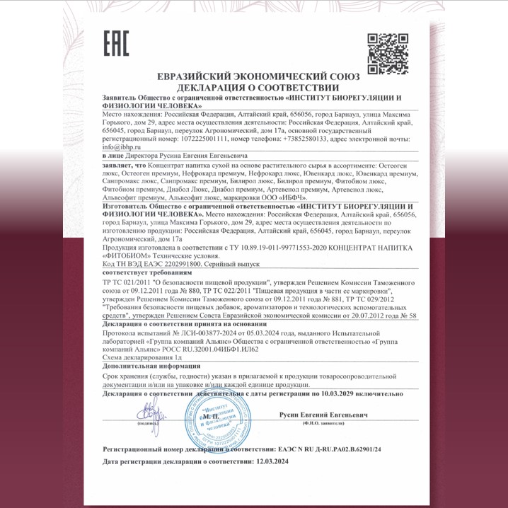 Вся продукция сертифицирована : Вся продукция, производимая компанией ООО «ИНСТИТУТ БИОРЕГУЛЯЦИИ И ФИЗИОЛОГИИ ЧЕЛОВЕКА», имеет все необходимые сертификаты соответствия и соответствует всем государственным стандартам качества.